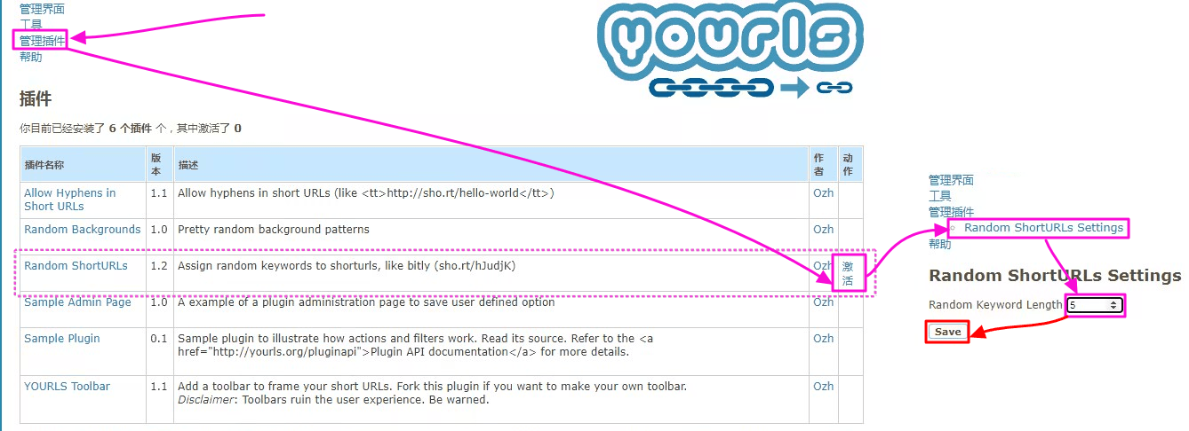 A:进入短连接程序后台,点击管理插件找到 Random ShortURLs 在右侧激活,激活后在管理插件下方能看到配置,点击进去可以设置自己需要的随机位数