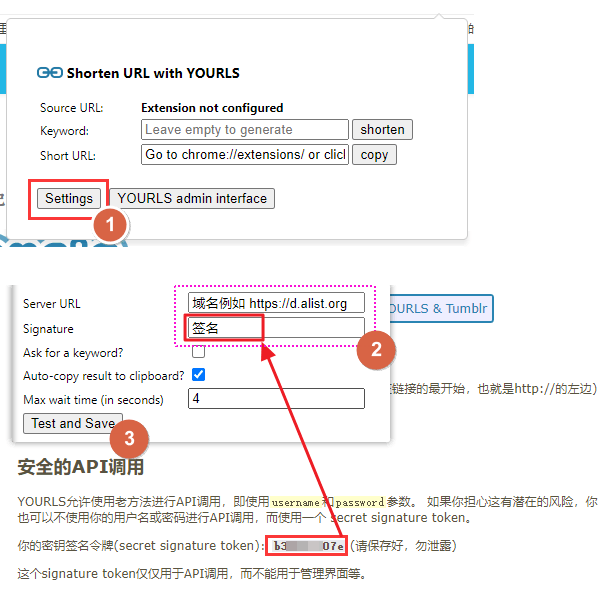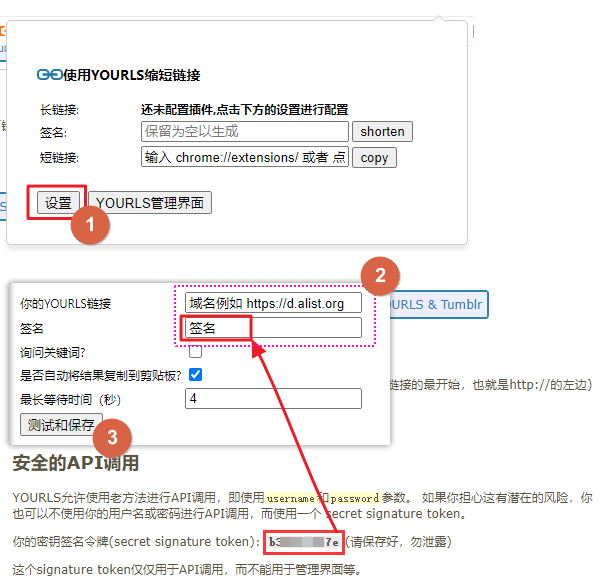 第二个选项里面的签名是在 http(s)://你的链接/admin/tools.php 页面里面的安全的API调用 标题的往下数第三行里面有个参数复制一下填写