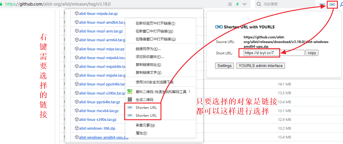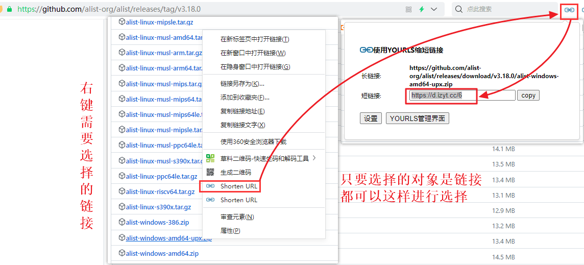 是否自动将结果复制到剪贴板? | Auto-copy result to clipboard?这样我们点击插件后就不要手动去点copy了它会自动帮你复制你只需要去粘贴分享即可 - 其实在链接右键会弹出的选项中也可以选择 YOURLS短连接程序 插件,然后点击顶部的插件扩展栏就会进行缩短链接