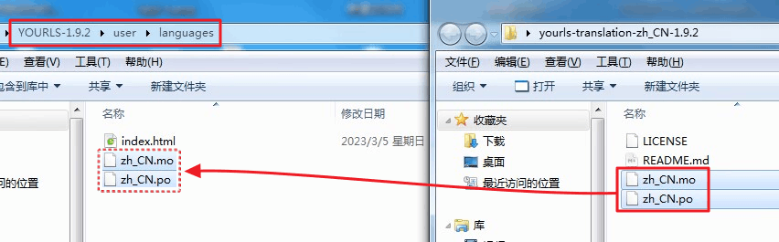 我们只需要把汉化包里面的两个文件(*.mo *.po)移动到 已经下载好的YOURLS程序包里面的/user/languages 文件夹就行