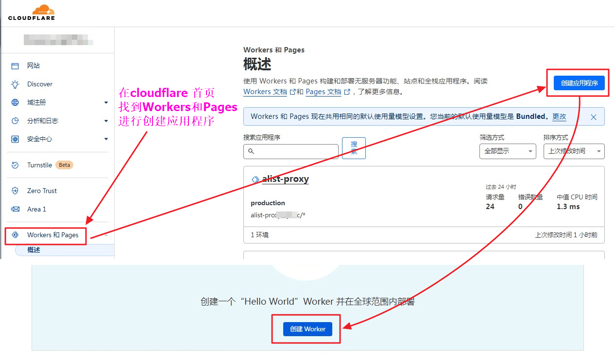 首先我们先打开 cloudflare首页找到左侧侧边栏的Workers和Pages点击新建一个应用程序
