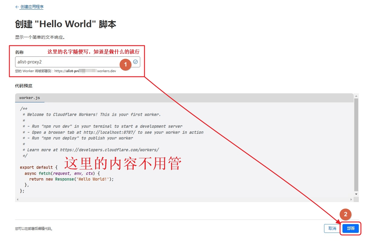 新建应用程序的名字随便写,自己知道是做什么的就行,为了方便这里起名叫 alist-proxy,至于里面的内容不用管,点击部署即可。