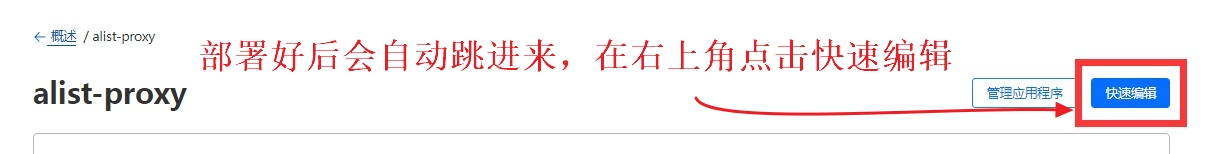 点击部署后我们会自动跳转到新建的 Workers 应用程序內,我们在右上角点击 快速编辑 进行修改。