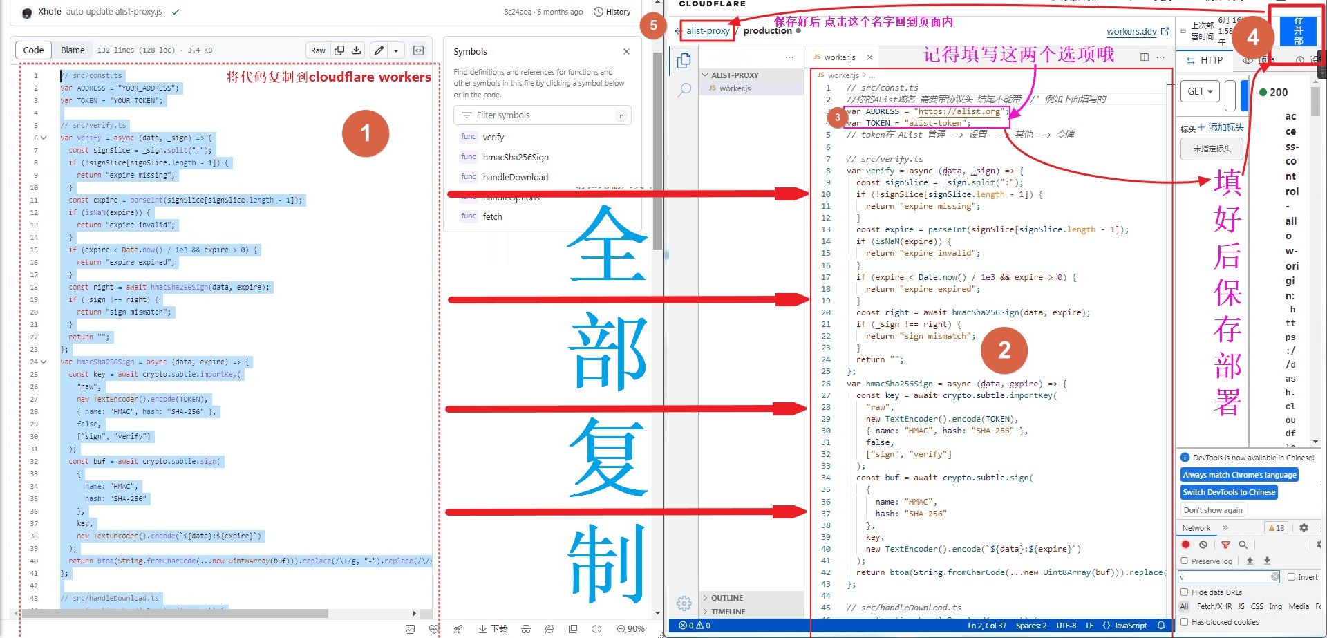 Workers 代码可以在 https://github.com/AlistGo/alist-proxy/blob/main/alist-proxy.js 找到,实际使用时需要替换其中的这两个变量: