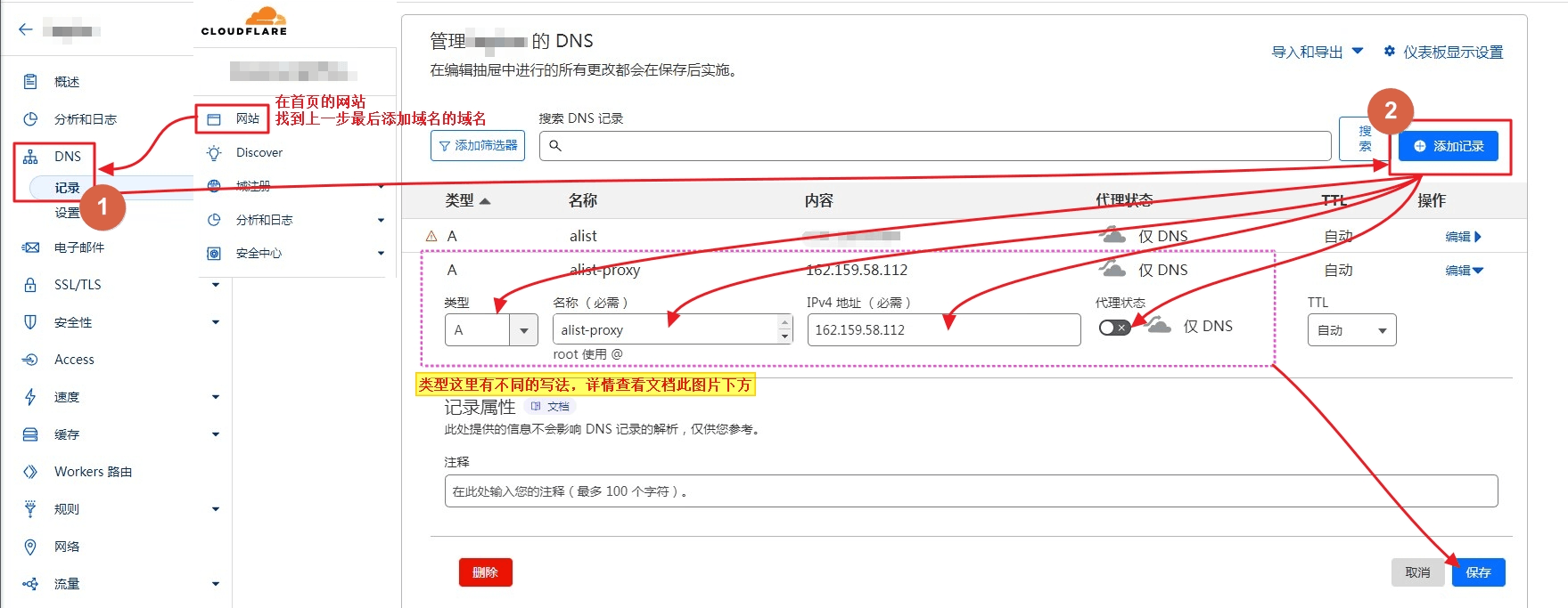 CNAME,名称正常写(解析访问使用的-例如也叫alist-proxy),目标:写我们上一张图添加完路由后显示的链接上面那个,alist-proxxxorkers.dev - 类型选择
