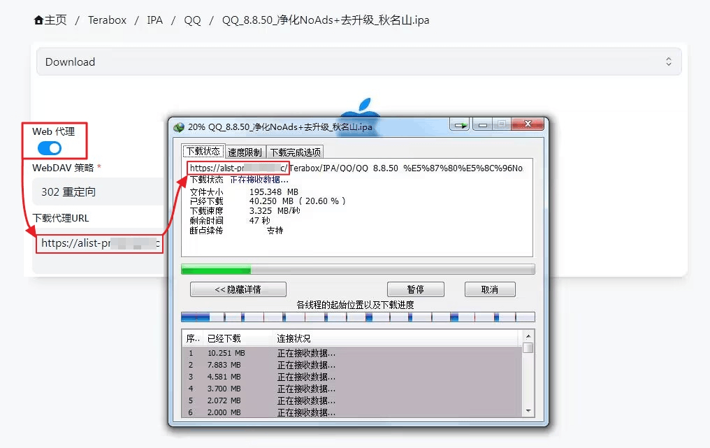 (左侧图)正常下载是302模式,直接返回了官方的下载链接,然后我们在AList挂载配置里面设置了代理(图右),然后点击下载同样的文件返回的是代理的IP(因为我使用的是 IP:端口号 方式)