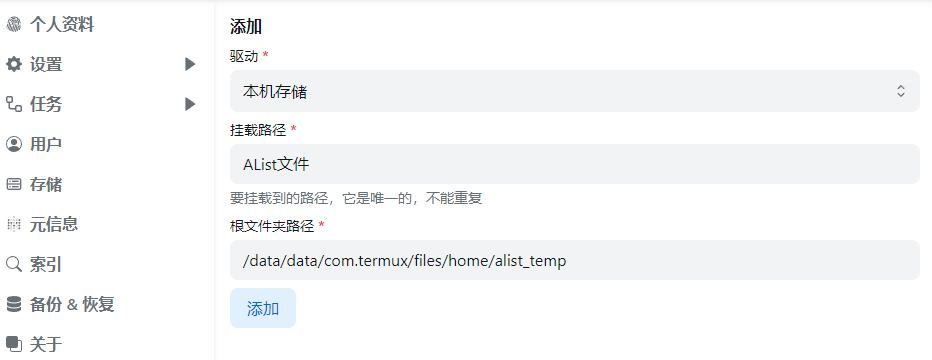 drwx------. x xx_xxxx xx_xxxx xxxx xxx x xx xx data在 AList 根文件夹路径填写 /data/data/com.termux/files/home/alist-temp 然后保存
