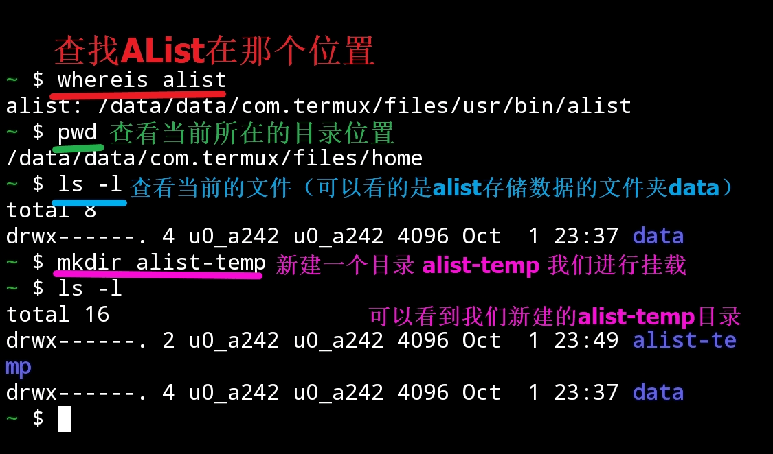 alist: /data/data/com.termux/files/usr/bin/alist #alist所在位置不过不直接挂载这个路径,我们挂载另外一个,就是我们光标命令所在的位置