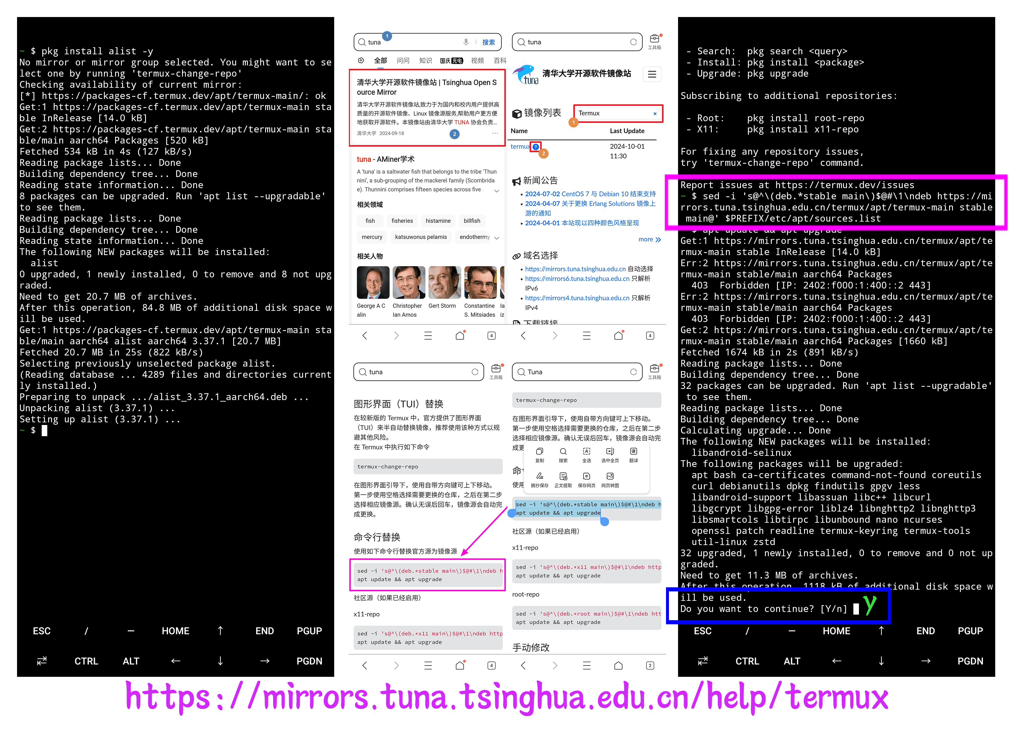 apt update && apt upgrade源获取链接:https://mirrors.tuna.tsinghua.edu.cn/help/termux